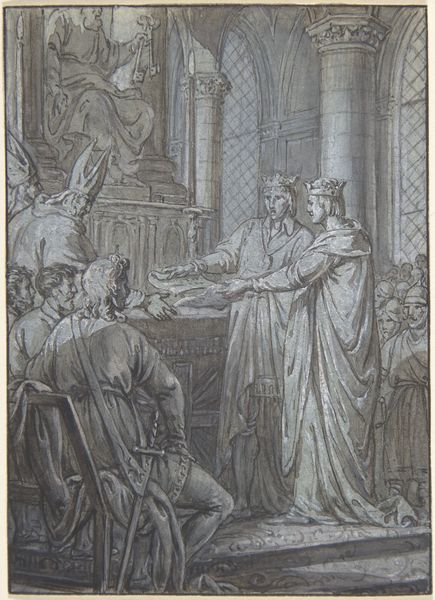 Editor: So, this drawing is called "The Circumcision" by Gerard de Lairesse, done sometime in the mid-17th to early 18th century. It's a pencil drawing, quite detailed. I find the expressions on the faces fascinating; what symbolic readings do you see in this piece? Curator: It’s a compelling rendition of a significant rite. Beyond the immediate biblical narrative, I see layers of cultural memory being activated. Notice how Lairesse uses light. Where does your eye go first? Editor: Definitely to the baby and the…priest, I guess. The lightest parts are centered there. Curator: Exactly. Light often symbolizes divine presence. The circumcision itself is more than just a physical act; it's a symbol of covenant, a binding agreement across generations. And what about the faces around? What emotions do you perceive? Editor: There's a mix. Some seem reverent, others…almost worried? It’s subtle. Curator: Precisely. Worry could represent the pain but also, more deeply, a questioning of tradition. The image becomes a space where faith and doubt coexist, a very Baroque sensibility. It invites us to contemplate the emotional and psychological weight carried by religious symbols. Editor: So, it’s not just a depiction, but an exploration of what this ritual *means* to those involved? Curator: Indeed. And its echoes resonate through history, informing ideas of belonging, obligation, and cultural identity. The candle light, the architecture, and even the folds in the robes, all become signifiers in a larger, ongoing story. Editor: That makes me look at it in a totally new way. I was just seeing a historical scene, now I am contemplating intergenerational trauma! Curator: Visual culture acts like a cultural memory, a reminder of collective experiences of past people which shape future generations. Editor: This gives so much meaning to art pieces! Thanks for that enlightening overview. Curator: My pleasure. I, too, learned a great deal.
