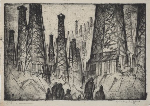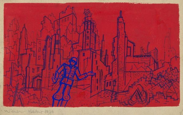 Karl Wiener created this drawing, "Die Erde bebt," using graphite, rendering a scene of devastation with stark clarity. The composition is dominated by a classical column, atop which stands a lone figure, surveying a landscape fractured by volcanic eruptions and crumbling architecture. This juxtaposition of the classical with the cataclysmic sets up a powerful visual tension. Wiener's use of line and shading creates a dynamic interplay between chaos and order. Notice how the precise lines of the column contrast sharply with the billowing, smoky forms of the volcanoes, destabilizing any sense of harmony. The figure, seemingly untouched, acts as a stoic observer, his presence raising questions about humanity's place amid environmental upheaval. The drawing's symbolism invites layers of interpretation. The broken city may reflect anxieties about modernity, progress, and the destructive potential inherent in human endeavors. It makes us consider the transient nature of civilization against the backdrop of geological forces, thus challenging our assumptions about stability and control.