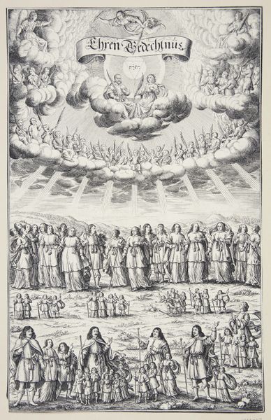 Editor: This is Mathäus Küsel's "Kingdom of Jove with the banquet of the gods; set design from 'Il Pomo D'Oro'", created in 1668 using engraving techniques. The overwhelming detail and almost theatrical staging give it a grand, almost dizzying feel. How do you interpret this work and its many layers? Curator: Well, let’s think about what a banquet signifies, especially a banquet of the gods. It’s a celebration, yes, but more profoundly, it’s about communal identity, shared power, and reinforced hierarchies. In the Baroque period, these types of images reaffirmed cultural values and stability. Editor: So, it’s not just a party scene, it’s a symbol? Curator: Precisely. Consider the figure of Jove – or Zeus, if you prefer the Greek interpretation – positioned centrally at the head of the table. He's not merely presiding; he represents divine order and authority. Everything, from the precise arrangement of the figures to the overwhelming symbolism that you noted, speaks to a meticulously constructed ideology. Editor: What about all the clouds and the elaborate vessels on the sides? They almost look like props in a play. Curator: They *are* props in a way! It's a stage design. The clouds indicate divinity and transcendence, while the ornate vessels emphasize opulence and abundance. It creates a spectacle to overwhelm the viewer, suggesting both earthly and celestial power. What kind of impact does this visual language have on you? Editor: It feels like controlled chaos, a spectacle designed to communicate very specific ideas about power and status. I now notice how much the image speaks of constructed authority rather than simply illustrating a myth. Curator: Indeed. Recognizing how such images manipulate symbolism helps us to understand the visual language of power in any era, not just the Baroque. It demonstrates that symbolic imagery communicates collective desires and aspirations that persist over time.