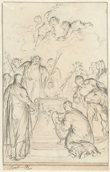 Curator: This is William B. Annin's engraving after Moritz Retsch's "Game of Life," currently residing in the Harvard Art Museums. Its stark lines create a world heavy with allegory. Editor: Indeed, a pensive mood washes over me. The contrasting figures locked in contemplation before the chessboard hint at deep struggles. Are we witnessing a battle for the very soul? Curator: Annin’s work, particularly through the lens of Retsch, suggests a critical commentary on societal structures. Here, the chessboard serves as a stage where power, mortality, and innocence collide. Editor: I note the angel overseeing the game, a potential symbol of divine intervention, or perhaps just silent witness to the unfolding human drama. It brings the politics of moral imagery to mind. Curator: Absolutely, and consider the social context. Engravings like this democratized access to art. What statements were being made about the viewers' roles in their own "games of life"? Editor: It makes one consider art’s role in shaping public perception of morality and the individual's place within society. Curator: It urges us to examine the forces shaping our narratives. Editor: It serves as a grim reminder of the stakes.