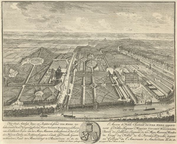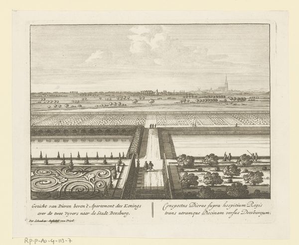 Curator: Immediately, I am struck by how vast and precise everything appears; even rendered in monochrome, the image gives the feeling of being pulled far, far back to observe an incredible view. Editor: This engraving, dating from around 1700, offers us precisely that kind of view. It’s called "Gezicht vanuit Huis de Voorst op de stallen, tuinen, landerijen en in de verte Zutphen," or "View from Huis de Voorst of the stables, gardens, farmlands, and in the distance, Zutphen." Pieter Schenk is the artist. Curator: Schenk really captured that almost obsessive sense of order in formal gardens of the time. Those repeating patterns... they're soothing and a little unsettling. Like nature perfectly subdued by human will. Editor: And what a show of that will! What we're seeing here isn't just a garden, it’s a total landscape being managed. You’ve got the manicured gardens giving way to the working farmlands, all leading toward the distant cityscape. Curator: It feels a bit like looking at a stage set, with Zutphen painted as the backdrop. Everyone in this tableau has their role: the finely dressed strolling along the terraces, the farmers working the land. Is that a procession of carriages heading straight towards the town itself? Editor: Exactly! And notice how Schenk positions us, the viewer, elevated, looking out from the Voorst estate? These kinds of estate views were popular because they were about projecting power. The order and control demonstrated in the landscape reflect the owner’s authority. Curator: There’s also something inherently romantic, even fantastical, about the vista; a land both ordered and untouched at once. And it all pulls the eye irresistibly into that misty horizon. Editor: It reminds us that art, even in its most documentary form, is never a neutral record. It reflects and reinforces particular social and political realities. Curator: Even now, contemplating this piece, it is possible to pause, reflect, and find a strange, unexpected kind of solace and beauty, don't you agree? Editor: Indeed. "Gezicht vanuit Huis de Voorst" offers a lens not just onto a physical landscape, but also into a complex moment in history and representation.