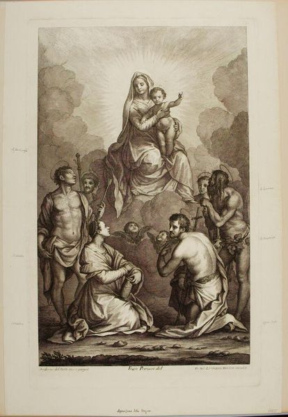 Editor: This is Bernard Picart's "Annunciation," an engraving. It feels like a stage, with Mary and the angel Gabriel presented before a divine audience. What do you see in this piece, beyond the obvious religious narrative? Curator: I see the social construction of female virtue. The scene is less about divine intervention and more about the patriarchal expectations placed on women, especially concerning purity and submission. Note Mary's downcast gaze, her posture of humility. Editor: So, it's a statement on societal control? Curator: Exactly. The Annunciation, throughout art history, becomes a vehicle for reinforcing gender roles and power dynamics. Consider who commissions these works and the messages they intend to convey. Do you think Mary has any agency here? Editor: I hadn't thought of it that way. It definitely changes my perspective on the piece. Curator: Right, analyzing the socio-political context adds layers of meaning.
