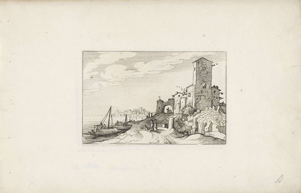 Curator: Immediately striking is the contrast between the crumbling structures in the foreground and the delicate cityscape beyond, almost ethereal in its rendering. Editor: That etching has a distinct coolness to it. The stark lines almost feel brittle, echoing the ruinous structures dominating the composition. It definitely leans into the picturesque decay so favored at the time. Curator: Indeed. This is "View of Rome from the Pincio" by Claes Jansz. Visscher, dating to 1618. He employs line in a way that meticulously models form. It’s Baroque, with influences from the Dutch Golden Age tradition. Look at how skillfully he establishes depth and perspective through the varied density of lines. Editor: As an etching, the line work makes complete sense as an aesthetic strategy for printmaking. But look how Visscher captures a kind of cultural consumption. We are meant to marvel at Rome's architecture while literally standing atop remains. It raises the question: is the artistry in the buildings themselves, or is the print serving to sell an exotic landscape? Curator: A pertinent point. Notice the strategic placement of figures—perhaps tourists themselves—mediating between ruin and Renaissance. Consider also the sky. Visscher subtly captures the atmospheric effects that guide the viewer's eye from the earthly ruins to the spiritual dome, further enhancing perspective. Editor: You are making me appreciate how labor-intensive the printmaking was for Visscher. Etchings took time. With each stroke, a cultural valuation took place. Each print became a form of property for the Dutch viewer to consider Rome. I think it gives real insight into class and power in the early 17th century. Curator: An insightful perspective on Visscher’s process. It is not merely representational. There’s certainly something symbolic about that dynamic space he creates, with layers of meaning embedded in his skilled manipulation of line and form. Editor: I find I now see this cityscape in a different light, a carefully crafted commentary on the ephemeral nature of architectural authority that is not always visible. The artist created so much by manipulating these very basic raw materials and his craft, transforming them into something imbued with potent sociopolitical ideas.