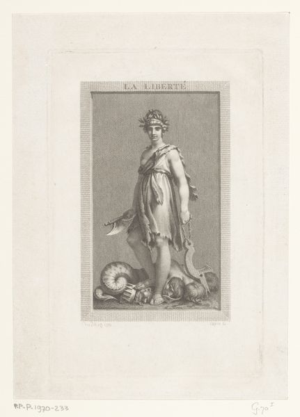Curator: Here we have "Vrijheid," or "Freedom," an engraving dating from 1849, by Auguste Paul Charles Anastasi. The allegorical depiction of liberty makes me think about its production context. Editor: It feels charged, doesn't it? Heroic, yet unsettling. I mean, look at the laurel wreath almost floating above her brow and how her stance dominates the crushed figures below. Curator: Right, let's delve into that. Anastasi's choice of engraving as a medium would have allowed for widespread distribution of this image. Prints like these were easily circulated, which played a significant role in disseminating revolutionary ideas across social strata. Editor: The line work is impressive – so fine! Yet, for a message about freedom, the rigidity of the lines seems a little…constraining. Is that intentional? Maybe the weight of historical oppression symbolized in its very technique? Curator: A keen observation! Considering the failed revolutions of 1848 that swept Europe, including France where Anastasi was active, it's easy to interpret his artistic labor in the service of a cause but with clear ambivalence. Look at the symbols of tyranny under her foot—a king's head and a ram’s skull... They tell us quite explicitly about the subject and political tensions brewing at the time. Editor: True, but the details distract a bit. They almost turn it into political propaganda. Maybe a broader appeal could have ensured more public appeal for the cause. Then again, those sharp lines underscore her authority... maybe this print wasn't only made to persuade. Curator: The social and economic disruptions wrought by industrialization were rapidly changing traditional artistic patronage models and pushing artists to find ways of addressing mass audiences while navigating new visual technologies and social movements. Editor: In a way, the technical mastery makes this 'freedom' feel less liberating. Almost imposed. A call to action, or perhaps an acceptance of how hard fought freedom can truly be. Curator: Exactly! "Vrijheid" highlights the convergence of artistic practice and social concerns, while complicating traditional art categories—questioning the hierarchy of fine art and craft in a period defined by intense political struggle. Editor: Thinking about the piece this way gives the figure in the image even more weight and gravity! Thanks for pointing out the historical production considerations. I won’t look at the print the same way now.
