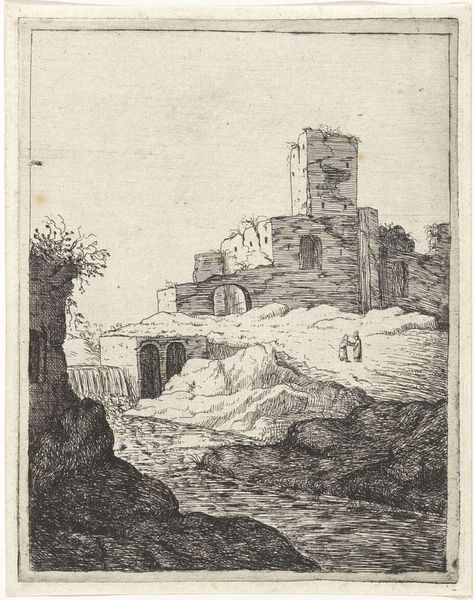 Curator: This print, housed here at the Rijksmuseum, is attributed to Thomas Wijck, titled "Landscape with a Round Tower in a Harbour," likely made sometime between 1626 and 1677. Editor: It immediately strikes me as melancholic. The monochromatic etching creates a somber atmosphere, punctuated by the imposing yet crumbling tower. Curator: The tower is certainly a central figure. We can think of towers, historically, as places of refuge, sites for defense or signals. A round tower, more structurally sound, could have symbolized fortification and endurance. Editor: But this tower is in decay. That deterioration, those missing sections… They undermine any initial sense of stability. Is Wijck trying to visually represent the fragility of human achievement against the inevitable decay of time? Curator: Perhaps. Also consider its location within a busy harbor. It could be an indication of a particular site, a landmark that helped identify the port. These ports, essential for Dutch trade routes, represented an expanding world, new encounters and exchanges. Editor: The etchings reinforce a strong sense of depth, which then suggests a wider narrative. In the foreground, the tiny figures near the boat feel very human scale compared to the almost mythological tower. The city and harbour create a backdrop for humanity. Curator: Note the figures. These are smaller than the setting, sure, but no less significant. Their placement foregrounds the ordinary tasks, juxtaposed against the backdrop of grand structures, suggesting human scale against grand projects. This image captures that moment where ordinary meets enduring legacy. Editor: Ultimately, though, it’s the ruin that lingers. The print achieves a careful tension—simultaneously romantic and filled with decay. It prompts reflection on the ephemerality of both human creation and perception. Curator: And indeed, on the way our memories construct both the grandeur and the vulnerability of our shared heritage.