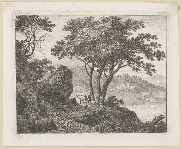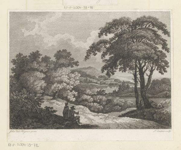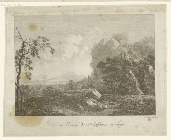 Peter Rücker made this print of the landscape near Basel, Switzerland, at the end of the 18th century. It shows a picturesque scene, but it's also a product of its time, reflecting specific social and cultural values. The image presents an idealized view of nature, carefully composed with a balance between the wild and the cultivated. The figures in the foreground, seemingly enjoying a leisurely stroll, suggest a sense of harmony between people and their environment. This aesthetic appealed to the sensibilities of the emerging middle class, who sought refuge in nature as a contrast to urban life. Prints like this were popular among collectors and art academies at the time. Rücker, who was Swiss, would have been influenced by the cultural values and artistic traditions of his country. To fully understand this work, we can look at the history of printmaking, the rise of landscape painting, and the social history of Switzerland in the late 1700s. The meaning of art is always closely tied to its historical and institutional context.