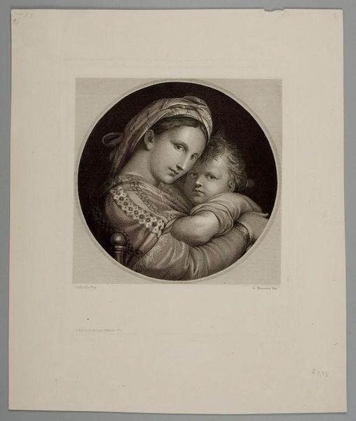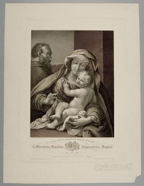 Editor: This is "Madonna of the Curtain" by Antonio Dalcò, at the Harvard Art Museums. The composition feels so intimate and the cross-hatching is beautifully done. What strikes you most about the formal qualities of this print? Curator: The artist's deliberate use of chiaroscuro creates depth and volume, doesn't it? Notice how the folds of the Madonna’s robes are rendered with such precision, guiding the viewer’s eye. How does the interplay of light and shadow affect your reading of the work? Editor: It almost feels like it adds a sense of drama and emotion to the scene. Curator: Precisely. The contrast emphasizes the tenderness of the figures, particularly the Madonna's gaze. Considering its tonal range, would you agree that the print possesses a sculptural quality? Editor: Definitely. I see how the artist used line and shading to give form to the figures and create a sense of depth. Thanks! Curator: Indeed, by focusing on these visual elements, we gain a richer understanding of the artist's intentions and technical skill.