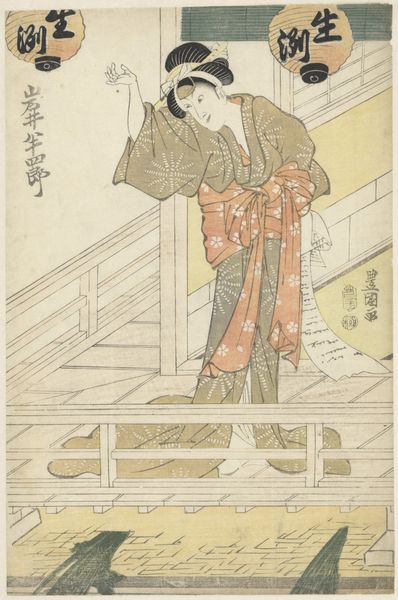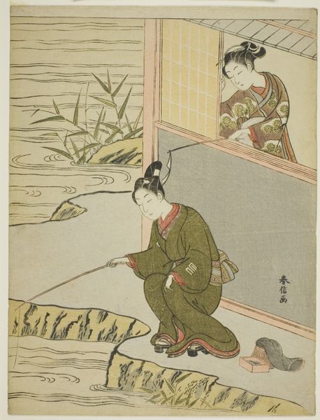 Curator: This woodblock print, "A Chinese Looking Out of the Window," by Totoya Hokkei, dates from around 1821. I find it quite captivating; it pulls the viewer into a peaceful yet enigmatic moment. Editor: Enigmatic is right. My first impression is contemplative solitude. The figure’s back is turned, and he's gazing at this blurred, distant landscape. The colors are muted, which adds to that sense of quiet introspection. It almost feels…melancholy. Curator: It's a wonderful example of ukiyo-e, capturing a slice of everyday life. Notice how Hokkei balances the interior and exterior spaces, inviting us to consider the relationship between the individual and the world around them. The Chinese man in his elegant robes serves as a focal point. Editor: His robes are really something—that soft, peach hue is lovely against the stark whiteness of the landscape visible through the window. Those patterns! And what's the deal with the discarded items on the floor there: is that tea ceremony equipment? Curator: Exactly! These items on the floor, paired with the books, suggest the trappings of a scholar's existence. It invites a deeper look into Chinese artistic motifs and philosophical connections reflected in Hokkei's selection of objects, each of which bears cultural relevance that's evolved through time. It's more than just observation. The objects indicate what is being appreciated in life by the scholar and how such appreciation informs wisdom. Editor: So, he's literally contemplating his place in the world through art and literature? Is that why the landscape through the window seems almost like a dream, slightly out of focus, less detailed, maybe to contrast the real from ideal? Curator: The rendering of the landscape also adds layers of meaning. Landscapes of this type are quite typical. His blurred depiction might emphasize how even something idealized may bear the blemishes of imperfection. We perceive life in that mode quite often, as reality may bring great challenges or not meet expectation. In this picture, he finds his inspiration from imperfect beauty as shown from nature as perceived from an unglazed window. It mirrors the intellectual and emotional state. Editor: It’s amazing how much emotion is conveyed in what seems at first like such a simple composition. He uses objects we may often come across or see without thinking much of, and transforms this very act to represent philosophical contemplation. Now, it’s a painting. Hokkei has made something special of what is perceived to be everyday items. Curator: Precisely. Hokkei, like many ukiyo-e artists, had a keen eye for observing and interpreting culture in meaningful forms. Editor: I will think more on all that the next time I boil my kettle, read, or contemplate what is seen. Thanks, Curator! Curator: An insightful reflection, Editor. Thank you!