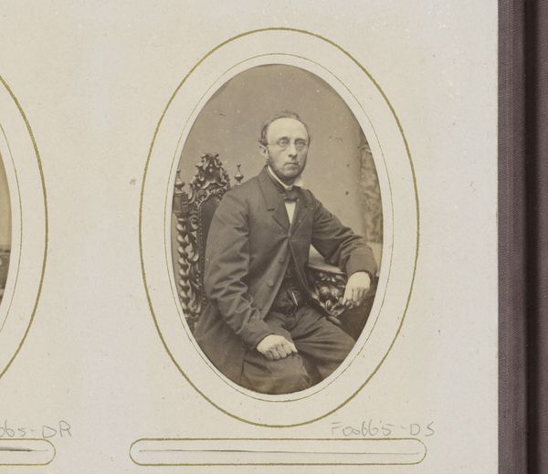 Curator: Here we have "Portret van een man bij een bureau," which translates to "Portrait of a Man at a Desk," dating from between 1859 and 1870. The photographic process itself is our medium. What's your immediate take on this? Editor: A solemn gravity. The oval frame emphasizes the sitter's enclosed world. The gaze is direct, holding you, almost challenging you. I detect hints of stoicism etched in his face, reflecting the era's prevailing mood of restrained virtue and serious purpose. Curator: Precisely. Now, consider how the emerging photographic technology shaped this visual representation. The cumbersome equipment, long exposure times, and the collodion process would necessitate a stillness, a constructed formality that inevitably colored the result. Editor: True. The symbolism feels deliberate, from his dark suit signifying power and influence, to the barely visible desk, implying labor, industriousness. It’s interesting how a material reading reveals so much. This objectification hints at an individual defined by productivity within the context of a developing capitalist economy. Curator: Indeed. Look at how the photographer makes the trappings of 19th-century masculinity apparent—a sort of stiff, upper-lip heroism. This sartorial choice is a means of performing belonging to the upper echelons. It says, “I am one of you." Editor: The dark tones also convey mortality. There is always something in the portrait's capacity to cheat death, capture that soul within this frame, and somehow still make the man appear imposing. Even as time moves on, his symbol persists. The man himself fades away, his cultural imprint endures. Curator: And perhaps a slight commentary on the fleeting nature of wealth. Photographs, once scarce, become increasingly accessible to wider swathes of society during this period. Suddenly, these visual declarations of permanence become mass produced. Editor: Food for thought. I can appreciate how these photographic items allowed middle-class men and women a lasting reminder that time indeed moves on and so did all those important things of this world. Curator: I agree, quite intriguing. These early photographic works present an engaging dialogue of how meaning, power and visual rhetoric all intersect with cultural production and material distribution.