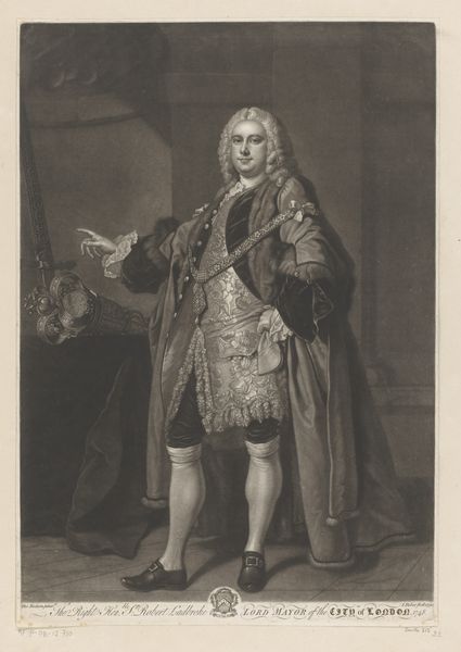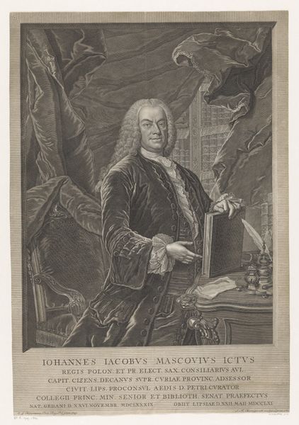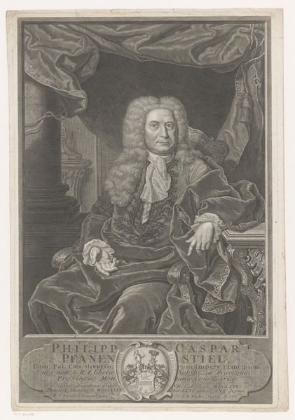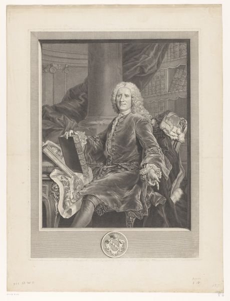 Curator: This is an engraving from 1788 entitled "Portret van Robert Walpole." It's currently held here at the Rijksmuseum. Editor: My initial impression is that this is imposing! It has a grand and weighty feel, achieved through the tonal range, a classical backdrop, and of course the dignified pose of the subject. Curator: Indeed. James Watson has presented Walpole in a calculated and authoritative manner, the baroque aesthetics really emphasising his power and status. Editor: The detail certainly supports that. Take, for instance, the richly adorned chair with its emblem; these motifs speak directly to Walpole’s high office, and that sense of responsibility. Curator: Absolutely. Symbolism plays a key role here, doesn't it? He is wearing ornate garments, and holding a document suggesting important administrative responsibilities. Even the classical statue in the background suggests a lineage of power. Editor: It feels a little formulaic in its presentation of status, adhering perhaps a little too closely to established visual tropes. It would be nice to see Walpole presented as more of a human being. Curator: That is an astute observation. However, I am also intrigued by how Watson used line and form to create a very striking image; there's a satisfying structural integrity to the portrait which elevates it beyond a simple likeness. Note especially the contrasting textures within the monochromatic framework. Editor: Yes, that attention to line and contrast gives the portrait real presence. The composition directs the viewer’s eye, certainly reinforcing his importance. Ultimately, a symbolic presentation that fits within a broader historical narrative. Curator: Yes, considering the cultural context certainly amplifies its meaning beyond just a composition exercise. Editor: It allows me to reflect on Walpole’s place in history and to better decode some of his authority. Curator: For me, it provides further evidence of the technical and creative possibilities inherent in printmaking.
