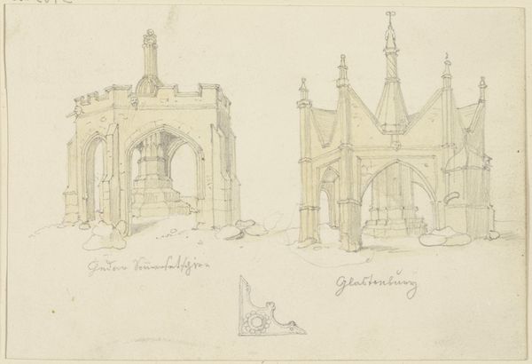 Editor: This intriguing sketch, titled "Die Marktkreuze in Malmesbury und Salisbury" and attributed to Karl Ballenberger, captures architectural studies rendered in pencil and ink on paper. The contrast between the detailed, almost fragile lines of the market crosses and the emptiness surrounding them evokes a sense of abandonment, doesn’t it? What's your perspective on this piece? Curator: Absolutely. Considering Ballenberger's process and materials—pencil, ink, paper—we can examine the social context in which architectural drawings were produced. These weren't merely aesthetic objects; they were working documents, proposals, records tied to material production in the form of buildings. The sketch highlights labor, the craft of draughtsmanship applied to architectural design and how it mediates consumption. The fragility isn't just aesthetic; it’s indicative of the temporary nature of even the grandest designs on paper before becoming the material reality of stone and mortar. How do you think the etching process reflects or influences this perception of temporality and materialization? Editor: That’s a great point; the ephemerality makes me consider the intended audience too. Was this simply a reference, or meant to be disseminated further? Curator: Exactly! The reproductive nature of etching invites us to think about wider distribution. Architectural plans influence production, and in this case possibly romanticizing those processes through these architectural renderings for a different type of audience. Editor: That really broadens how I see the work! I now see this more as a document in conversation with potential stakeholders or clients for some future construction project. Curator: Precisely! It reveals a layer of negotiation between the realms of ideas and tangible building materials. Editor: I've learned so much by considering this piece beyond its initial aesthetic value and how materials shaped its function. Thanks!