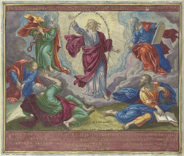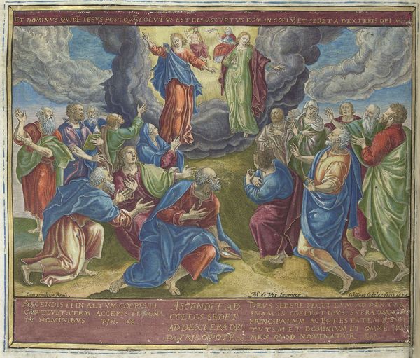 This tapestry, "The Ascension" from the Passion series, was created after a drawing by Albrecht Dürer. It was made around 1592, decades after Dürer's death, amidst the religious and social upheavals of the Reformation. The image depicts Christ ascending into heaven, surrounded by clouds, while his apostles kneel and gaze upwards. Tapestries like these were not merely decorative; they served as powerful visual aids in a society where literacy was limited. In representing this pivotal moment of the New Testament, the tapestry underscores themes of faith, hope, and divine promise, reflecting the intense spiritual preoccupations of its time. Consider how the artist employs color and composition to evoke a sense of awe and reverence. The upward gaze of the apostles draws us into their emotional experience of witnessing the divine. This work provides a window into the complex interplay between art, religion, and society in the late 16th century.
