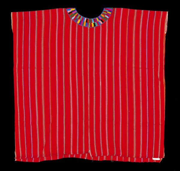 Editor: So, this is "Man's Shirt (Camisa)," a cotton textile from around 1940. The vertical red and black stripes are quite striking. What's particularly interesting to me is the clear evidence of hand-weaving and the texture of the fabric itself. What do you find most compelling about this piece? Curator: For me, it's the overt labor involved in its creation. We have a textile object meant for daily life. The simple, repetitive pattern speaks volumes about the time invested, the community involved, the probable local sourcing of materials, and the wear and tear it would have endured as a simple, sturdy object of clothing. It challenges the traditional notion of "art" divorced from practical application, doesn't it? Editor: Definitely. Thinking about the weaving process, do you see a specific cultural influence in the construction of the shirt? Curator: It's less about singular cultural influences and more about the material conditions. Consider the limitations and possibilities offered by available resources. Locally grown cotton? Particular dye techniques passed down? How would those things influence a piece meant to be both functional and possibly display status or membership in a group? These are handmade realities made visible in every stitch and stripe. The wear and possible repairs it endured further enrich our appreciation. Editor: That really reframes how I see the shirt. It's less about artistic expression and more about the lived experience embedded in the material. Curator: Exactly! By prioritizing materiality and process, this shirt becomes more than just a garment; it's a powerful artifact embodying the socio-economic realities of its creation and use. It’s exciting to consider the historical chain that extends from plant to garment, from human effort to the wearing of the cloth. Editor: Thanks for pointing that out, it’s changed my whole view of this work. I initially just saw a simple shirt! Curator: Indeed, looking at it that way, this ‘simple’ garment expands to encompass so much more.