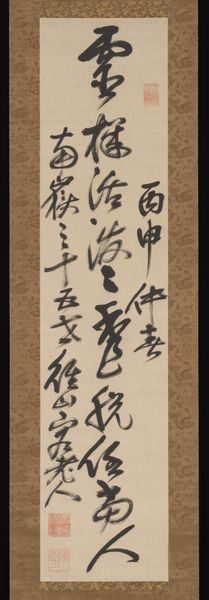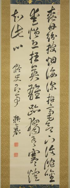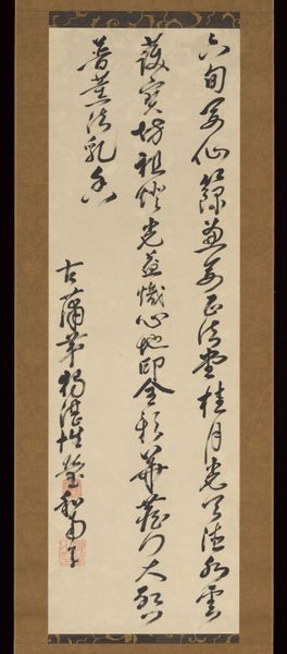 This hanging scroll, made by Jakugon in the eighteenth century, presents a Chinese poem rendered in dynamic strokes of ink on paper. The composition rises vertically, encouraging the eye to ascend through the calligraphic forms. Jakugon’s brushwork varies from thick, bold gestures to delicate, almost skeletal lines, creating a visual rhythm that oscillates between density and openness. The stark contrast of the black ink against the pale ground emphasizes the texture and movement inherent in each stroke. The characters, though rooted in tradition, lean towards abstraction. The forms push against conventional legibility, evoking a sense of the poem’s meaning, rather than literally illustrating it. The poem, extolling a reclusive lifestyle, finds a visual echo in the artwork's formal qualities. The rugged, unconventional forms mirror the idea of breaking away from societal norms. The poem is not just read, but visually experienced. The brushstrokes remind us that art is a site where tradition and personal expression meet.