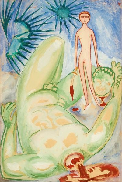 Editor: Here we have Bernard Meninsky's *Sleeping Woman in a Landscape*, held at the Tate. It’s striking, this pale figure against such bold colours. How do you interpret this work? Curator: It invites us to consider the historical context of the male gaze and its power dynamics. Meninsky, painting during a period of significant social change, presents a figure vulnerable in repose. What does it mean to depict a woman this way, given the historical objectification of the female form? Editor: I see. It does feel a bit…uncomfortable now that you mention it. Curator: Precisely. This discomfort is productive. It prompts us to question the artist's intentions and reflect on how societal norms shape our perceptions of beauty and power. Considering Meninsky’s own struggles with mental health, is this about vulnerability rather than exploitation? Editor: That adds another layer. I'll definitely be thinking about this one for a while. Curator: Indeed. Art acts as a mirror, reflecting our own biases and assumptions.