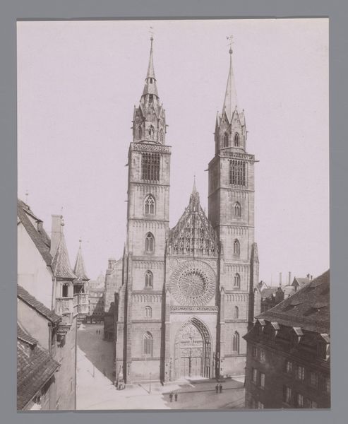 Editor: Here we have Étienne Neurdein's photograph, "Kathedraal van Nancy," taken sometime between 1870 and 1900. The gelatin-silver print captures the cathedral in all its neoclassical glory. I find myself drawn to the photograph’s rather subdued and serious mood. What are your thoughts? How do you interpret the visual language at play here? Curator: The image resonates with a yearning for permanence, doesn't it? Consider the cathedral itself – a symbol of spiritual authority, amplified through architectural elements deliberately evoking antiquity. The clean lines, balanced symmetry, and the carefully positioned clock, speak to humanity’s aspiration for order, structure, and, fundamentally, control over time. This visual vocabulary becomes especially poignant in the context of 19th-century France. Does that reading resonate? Editor: It does. The clock feels less about practicality and more like a reminder of mortality within something designed to be eternal. Curator: Exactly! That tension—between the earthly and the eternal—is precisely what makes religious art so potent. But consider, too, the figures in the foreground, the horse-drawn carriage. These elements situate the cathedral within a lived reality. What might the placement of these elements suggest about society’s relationship with such institutions? Editor: Perhaps that the grand structure and ideals represented are embedded in daily life? A constant presence rather than a distant concept? Curator: Precisely. And photography, a relatively new medium at the time, reinforces this tangible presence, documenting the architecture. Notice how the grayscale further abstracts reality towards conveying symbolic meaning and weight. Editor: So, through Neurdein’s choices of composition, lighting, and subject matter, we're able to perceive these symbols in action and appreciate their continuing impact. That's insightful! Curator: Indeed. It is about more than simply recording history; it is how this work interprets and memorializes cultural memory.
