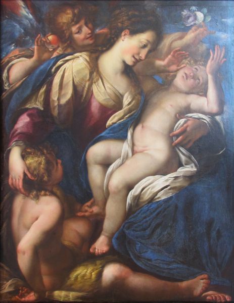 Editor: Here we have "Angelica and Medoro," an oil on canvas created around 1600 by Bartholomeus Spranger. The figures almost seem to spill out of the frame, a tangle of limbs and drapery. What can you tell me about this composition? Curator: The Mannerist style is strongly present, showcasing a deliberate distortion and exaggeration. The anatomical forms are not realistically rendered but stylized for expressive effect. Observe the pronounced musculature of Medoro and the elongated, almost serpentine, pose of Angelica. Editor: So the artist wasn't necessarily going for realism here. Curator: Precision is subordinated to artistic license. Note the use of color: vibrant and somewhat artificial, creating a heightened sense of drama. How do the draperies function within the overall design? Editor: The folds and colors of the draping create this swirling dynamic movement throughout the canvas that feels expressive, especially with the stark contrast against the dark background. What is being emphasized in using color in this way? Curator: It draws our attention to the surface itself. Mannerism values artifice and refined style over the naturalistic. Spranger seems to be consciously flaunting his technical skill, manipulating forms and colors for purely aesthetic impact. The gazes are indirect, internal and self-aware. The meaning seems less important than the execution itself. Editor: So it is almost more about how it is painted rather than what is painted? Curator: Exactly. Spranger invites us to appreciate the work as a demonstration of artistic ingenuity rather than as a representation of external reality. By directing us to see how this image is artificially constructed rather than how it is reflecting its narrative roots, we can come to fully understand the artist’s Mannerist practice. Editor: This has offered such a new way of considering painting through form, rather than pure representation, which allows us to think differently about this piece. Curator: Indeed, this formal approach helps us understand the period in a more complex way.