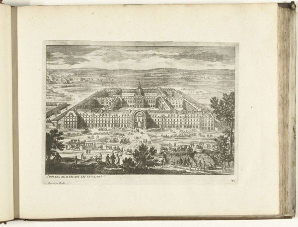 Curator: Welcome. Before us hangs a striking view of Paleis het Loo, rendered in a print by Jan van Call around 1700. Editor: It has a rather stern feel, doesn't it? That aerial perspective and intricate line work really emphasize the formality of the architecture and the garden layout. Curator: Indeed. The precise engraving highlights the carefully planned structure. Notice how the composition directs our eye along those strict axial lines leading back into a vanishing point set in a deep field? Editor: I can certainly see what you mean by how we are 'directed', and note how powerful royal palaces appear time and time again in European iconography to reinforce absolute authority with geometrical planning and vastness that dominates nature! Do we have more of a feeling for the story around why it was engraved, or how it has been interpreted? Curator: Well, the line engraving is, I feel, a vehicle in service of this meticulous Baroque ideal, the intent behind these carefully incised marks is perhaps, primarily, clarity of form. Every element, every edge, seems intended to underscore the imposing architecture, and controlled landscaping on display. Editor: True but even more! This visual order must also represent something important about human ambition and the imposition of absolute authority! Beyond being 'just' a palace this carries within it a claim on identity. Palaces like these communicate messages about wealth, lineage, power. It would have a significant impact as the 'Gezicht' or visage that the populace had of their rulers, as intended I am certain. Curator: An intriguing suggestion! This visual perspective certainly seems to mirror royal privilege and their elevated vantage. The linear elements really guide one’s vision across the vast layout. Editor: Jan van Call, by portraying Paleis het Loo in this detailed form, provides a glimpse into the heart of 17th-century Dutch power and, more subtly perhaps, into the semiotics of sovereign representation. Curator: Perhaps this precise mode of depiction, typical for topographical prints of the period, might also symbolize scientific method itself – observation, measurement and meticulous documentation. I appreciate its sharp, measured technique now that we have studied it closely together. Editor: Yes. Contemplating it together allows a rich story to be unlocked from the lines and perspective on view. Thank you for joining me.