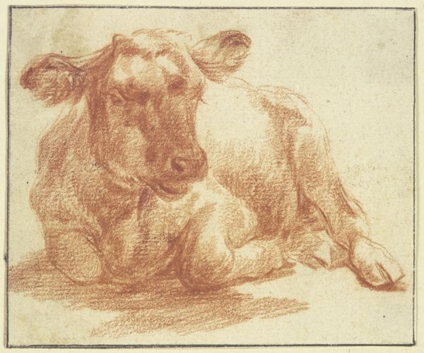 Editor: So here we have "Liggende koe," or "Reclining Cow," a pencil drawing from the Dutch Golden Age by Jan de Bray, made somewhere between 1651 and 1657. It's just a simple sketch of a cow at rest, but there's something so peaceful about it. What do you see in this piece? Curator: I see the echo of ancient pastoral scenes, the very foundation of settled society. This cow, so simply rendered, becomes a vessel of cultural memory. We’re talking about a period obsessed with realism. Does the cow represent fecundity, tranquility, or maybe the bounty of the Dutch landscape, considering their economic ties to agriculture at that time? Editor: That's fascinating! I hadn't considered the cow as a symbol. I was mostly reacting to the sort of soft texture of the drawing itself, which creates that sense of peace I mentioned before. Curator: Indeed. It's not just what’s represented, but how. Think of the act of drawing itself. Why capture a mundane image so deliberately? This act transforms the everyday into something iconic, charging it with symbolic potential. This also could reflect Dutch society celebrating its economic success, with the cow as a national symbol. The texture reminds one of softness and care, but that contrasts the work the animal did providing food and labor. What could that contradiction tell us? Editor: Maybe it’s about finding beauty in the mundane, elevating the ordinary? I suppose the symbolism is much more complex than I initially thought. Curator: Exactly! The image speaks of cycles and traditions, resonating across centuries. From a formalist perspective, what do the animal’s curves imply? Editor: Hmm, I think it is comforting that an everyday object is celebrated. I see how the curved lines of the animal seem calm, and contrast its rough coat and difficult work it produces in our society. This adds complexity to this animal drawing! Thanks! Curator: My pleasure! Reflecting on our conversation, hopefully listeners will never perceive cows the same way again.