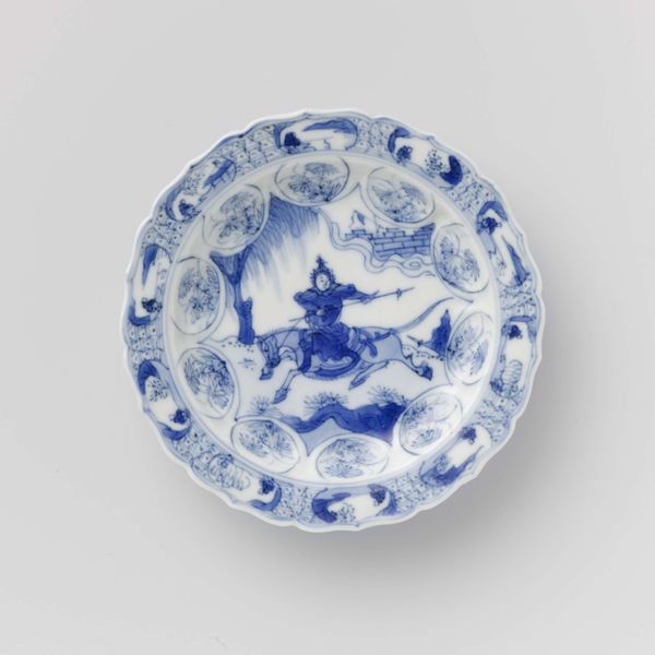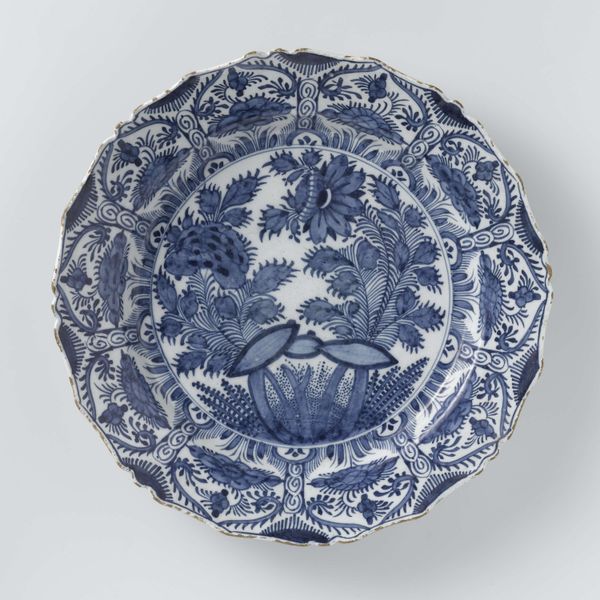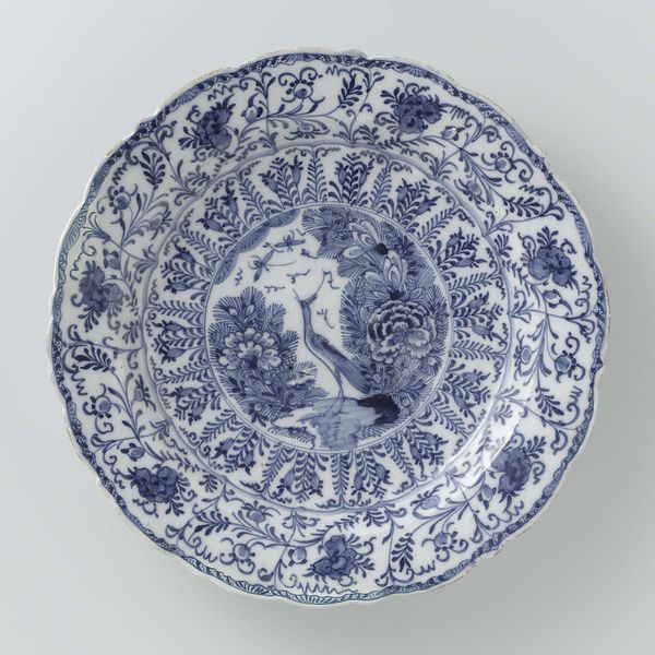 This is a plate with loose, flat decorations of pagodas, flowering branches, and a ship by Guillaume Lambert. The cultural movement of Chinoiserie, which influenced the artwork, was a reflection of Europe's fascination with East Asia during the 17th and 18th centuries. The blue and white design evokes traditional Chinese porcelain. However, the scene, although inspired by Asian motifs, is a European interpretation, a fantasy rather than a true representation. Consider the power dynamics at play during this period of intense colonial expansion. The appropriation and reimagining of Asian aesthetics served to exoticize and Other the East, reinforcing a sense of European superiority. What does it mean to admire and emulate another culture while simultaneously subjugating it? This plate exists in that complex space, reflecting both appreciation and exploitation. It reminds us to consider the nuanced and often contradictory ways in which cultures interact and influence one another.