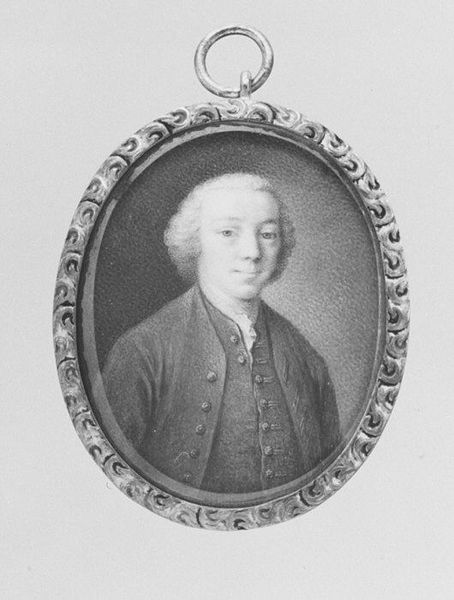 George Engleheart created this miniature portrait of an unknown man. The oval composition, measuring just 7 by 5.6 centimeters, is striking in its formal restraint and tonal harmony. Predominantly rendered in shades of gray, the subject's attire provides a stark contrast to the lighter background. The careful modulation of light across the face draws our attention to his gaze. Engleheart's technique, characterized by fine brushwork, achieves a remarkable level of detail within such a small format, adhering to the conventions of portraiture of that time. There is a clear emphasis on clarity and definition. This work reflects the historical and cultural context of portraiture, where representing social status and individual identity was crucial. The miniature format suggests intimacy, intended for personal contemplation rather than public display. The detailed rendering and controlled composition underscore a sense of order, yet the sitter's piercing gaze engages with the viewer, inviting ongoing interpretation.