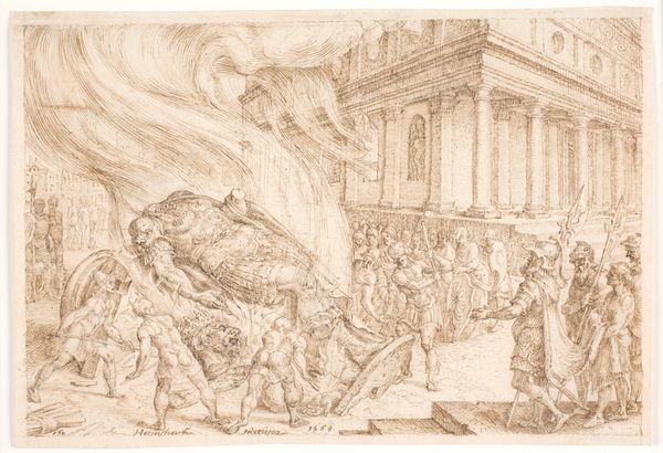 In this drawing, made by Maarten van Heemskerck, we witness Nebuchadnezzar and his Chaldeans plundering the Temple in Jerusalem. Note the potent imagery of destruction: the temple ablaze, its treasures carted away, and the solemn gaze of the triumphant soldiers. The depiction of the temple's destruction carries a loaded symbolism. Fire, often seen as a purifier, here signifies desecration and loss. This motif echoes through history, reappearing in depictions of sacked cities and razed sanctuaries, each instance a stark reminder of cultural and spiritual devastation. Consider how the burning of libraries in antiquity has symbolized the loss of knowledge and the suppression of thought. The act of plunder itself also symbolizes the transfer of power and cultural dominance. This scene evokes primal fears and anxieties. The cyclical nature of destruction and rebirth, loss and recovery, echoes throughout human history. Each symbol is not merely an image, but a vessel carrying centuries of collective memory and emotion.