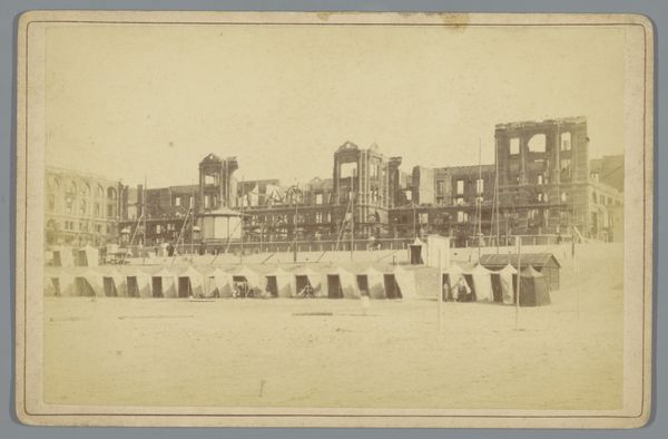 Curator: This gelatin silver print, titled "Ruïnes aan het Hofplein te Rotterdam," was taken by J. Nolte sometime between 1940 and 1945. It’s an incredibly stark depiction of the war’s impact on Rotterdam. Editor: Stark is right. The scene seems devoid of color, life... almost ghostly, emphasizing devastation as a central visual and emotional symbol. The exposed building frames and jagged debris really drive that home. Curator: The image offers a haunting historical record. Following the bombing of Rotterdam in May 1940, a large portion of the city was reduced to rubble. This photo isn't just a document of urban destruction, but it serves as a reflection on the socio-political dimensions of wartime photography. Editor: Those arched facades in the center almost look like skeletal remains. It makes me think of architectural motifs of strength and civic pride turned into emblems of vulnerability and loss. Is there any specific meaning attributed to that building's structure? Curator: I believe it's a commercial building, now stripped of its intended purpose, a visible wound inflicted by the war. Nolte’s choice to frame the ruined architecture against a backdrop of sky evokes a feeling of exposed vulnerability, something commonly observed across Europe’s urban landscape during the period. Editor: And in its raw depiction, devoid of artifice, it transcends its immediate context, resonating as a symbol of broader human resilience amidst overwhelming destruction. It forces one to question, what new societal structures rise out of this? Curator: Absolutely. What we see here is not just destruction, but also the start of reimagining, both the city’s and Europe's. I see this photograph as vital testimony. Editor: Looking at the photo again I feel it almost breathes with a subdued and resolute tone.
