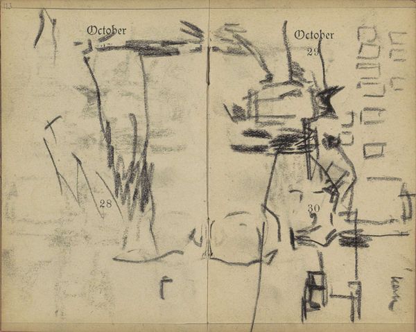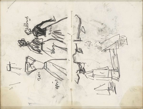 Editor: Here we have Paul Gauguin's "Group of Human Forms; A Man Seated" from 1884 to 1888. It's a drawing, seemingly a study with loosely rendered figures and landscapes. There's a quiet, almost melancholic feel to it. What do you see in this piece, especially considering the time it was created? Curator: What I find particularly interesting is Gauguin's departure from strict academic representation, even at this stage. We see him grappling with depicting modern life, but in a way that almost abstracts the figures, moving towards symbolism. Consider the art world at this time – Impressionism was challenging established norms, but Gauguin pushes further. It anticipates his later explorations of primal themes in Tahiti. These early works hint at his developing artistic and personal rebellion against societal conventions, visible through this very style of simple yet expressive drawing. Do you notice how he isolates the figures? Editor: Yes, there’s a definite sense of isolation, even among the “group.” Is this typical of artists breaking away from traditional portrayals of society? Curator: It can be. Representing isolation could be read as a social commentary, right? Perhaps Gauguin is responding to a feeling of alienation prevalent in rapidly modernizing Europe. The fragmented composition itself, divided into separate scenes, might symbolize a fracturing of social cohesion. These images may invite questions regarding representation of common men in European artwork during this time. Editor: That’s fascinating! I hadn’t considered the composition reflecting societal fragmentation. I tend to interpret it solely through the lens of his later work, but now I understand its place within broader historical and cultural shifts. Curator: Exactly. The politics of imagery are never separate from the socio-political forces at play. Even seemingly simple sketches can hold profound cultural significance when examined through a historical lens.