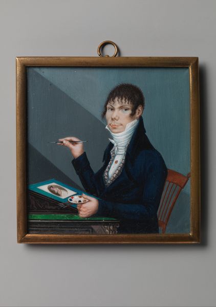 Editor: Here we have a painting entitled "Dr. Philemon Tracy," created around 1790. It's an oil on canvas and depicts exactly what the title states, with what looks like Neoclassical art qualities to me. There's something strikingly...direct about the subject's gaze. What stands out to you most in this piece? Curator: Ah, Dr. Tracy! To me, he always feels like he’s just overheard the punchline to a joke he doesn't quite get. It's that slight tension around the mouth, isn’t it? You see a world striving for order and reason in the late 18th century, bubbling beneath the surface. Editor: Definitely. I notice the almost folk-art quality mixed with the classical aspirations. It seems at odds somehow. Curator: Precisely! Look at the setting, almost like a stage backdrop, the decorative wallpaper. It is both charming and slightly unnerving; this awkward grace is not an Italian fresco or European history painting of the period. It reminds me how cultures digest influences. Does that floral background tell you anything different? Editor: Well, thinking about that awkward grace, I see the wallpaper as contributing to it with the odd combination of sophisticated taste and the sort of homemade charm you’d find in the colonies. Curator: Exactly! I love that read. It’s not just a backdrop; it’s part of the story of a burgeoning nation trying on different identities, different airs. Editor: I never thought about wallpaper telling stories about new identities. This work will now mean something entirely new every time I view it!