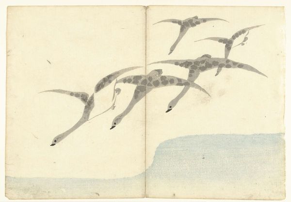 Kōno Bairei created this page from the ‘Picture Album of One Hundred Birds’ using woodblock printing, a technique refined in Japan over centuries. The key to this image lies in understanding the labor involved in its making. First, the artist would have painstakingly drawn the image, paying close attention to the texture and form of the birds in flight. Then, skilled artisans would carve the design into separate woodblocks, one for each color. The paper itself, likely made from the inner bark of the gampi tree, has a subtle warmth and fibrous quality. Consider the social context: woodblock printing enabled the mass production of images, making art accessible to a wider audience. Each print involved a division of labor: the artist, the carver, the printer, all contributing their expertise. In this way, what appears as a simple image of birds is actually the result of many hands, reflecting the integration of art and craft in Japanese society. It’s a reminder that even seemingly mass-produced images carry the trace of human skill and effort.