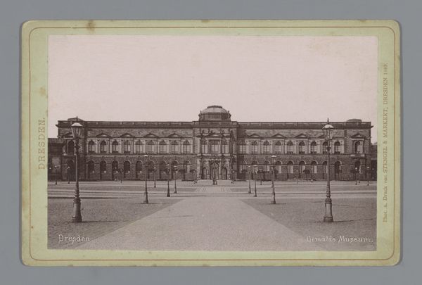 Curator: I'm captivated by the solemn atmosphere—almost feels like a ghost image. Editor: Indeed, it has a hushed quality to it. What we're looking at is a view of the Vienna State Opera, Austria, taken sometime between 1869 and 1891 by Hermann Heid. It is a photographic print, a daguerreotype offering us a glimpse into a specific moment in the city's past. Curator: That building! Its sheer opulence seems defiant against the flat, gray square around it. It feels… incomplete, like a grand stage without the play. The street feels totally devoid of the life one associates with theaters. Editor: Well, the bareness may stem from the limitations of the photographic technology of the time. Longer exposures would mean only stationary objects and people appear, hence the nearly deserted plaza. However, that absence also emphasizes the solid architecture, doesn't it? The rigid structure as a kind of emblem? Think of architectural photography—it often functions like a portrait of societal values. Curator: A portrait, yes! It certainly gives the building a heavy, stately weight, but the lack of context is killing me. Where are the horses, the bustle, the posters, all of it? Without it, it is devoid of character. I wonder why Heid chose this viewpoint. I suppose a different perspective may have altered the story significantly, right? Editor: It's likely less about pure artistry and more about documentation. He may have been interested in depicting modern urban improvements through realism, so he framed this to showcase a symbol of civic pride or perhaps, more dryly, to simply show its architecture for other construction projects. Curator: Documentation… oh, so a symbol frozen in time, made monumental through this ghostly depiction. So, that empty square then becomes more charged, loaded with a missing vitality. It has a certain melancholy—nostalgia for a vibrancy it seems destined to lose. Editor: A spectral city. A reminder that time is not just linear; it loops back, whispering. Looking closely, there’s something beautifully sad in the light caressing its stone details—it's architecture capturing both its history and premonitions.