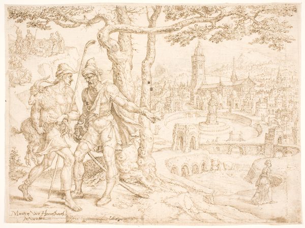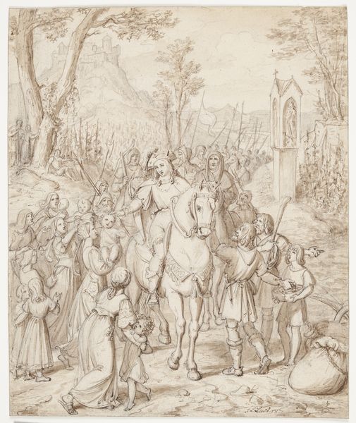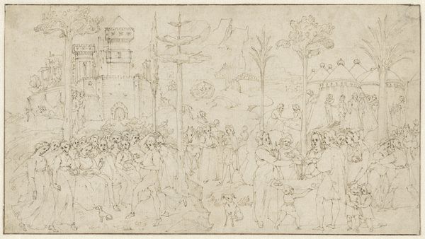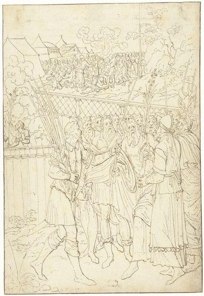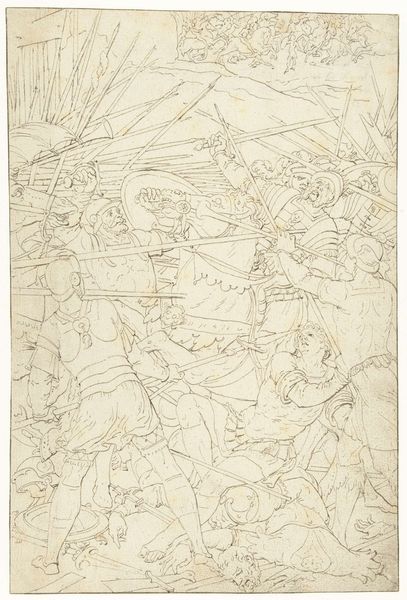 Curator: Looking at this ink and tempera drawing, “The Martyrdom of Saint Alexander of Bergamo” by Lorenzo Lotto, circa 1524, one is immediately struck by the rawness of the scene depicted. Editor: Yes, the flurry of lines conveys a stark sense of violence. It's gestural, and almost brutally immediate in its effect. But what is the cultural context here? How was martyrdom represented at that time, and what does Lotto bring to it? Curator: Well, Lotto was painting in Bergamo at a time of intense civic pride and religious fervor. Alexander was the patron saint of the city, so this work, intended as an altarpiece, reinforced civic identity while promoting religious devotion, all within the frame of the Bergamascan historical narrative. He is the lynchpin between military identity and religious veneration in that cultural context. Editor: That resonates with how Lotto stages the scene – a collision between the earthly and the divine. Look at the saint presented in isolation at the front of the scene: then notice how, if you keep looking, a whole history unfolds behind him. The angels hovering overhead, representing divine intervention, and in the background, multiple depictions of Roman soldiers are carrying out executions on a hill, reminding me a little bit of war propaganda or the type of violent paintings that came out of revolutionary France. Curator: Precisely. Consider too how Lotto has used the materiality to create a heightened, emotional connection with the scene. This artwork becomes more than an illustration, its graphic qualities become a crucial feature: Alexander, caught at the exact moment he will meet his end, encapsulates the complexities and tensions that underline devotion and persecution as a key framework to define an experience, a belief. The drama underscores the moral dimensions within Bergamascan society. Editor: Indeed, what makes Lotto’s work so powerful is his ability to imbue history with emotional resonance. Rather than simply documenting the facts, he used art to comment on the ongoing political climate of the region through both religious and personal iconography. Thank you for bringing the history alive! Curator: The pleasure was mine.