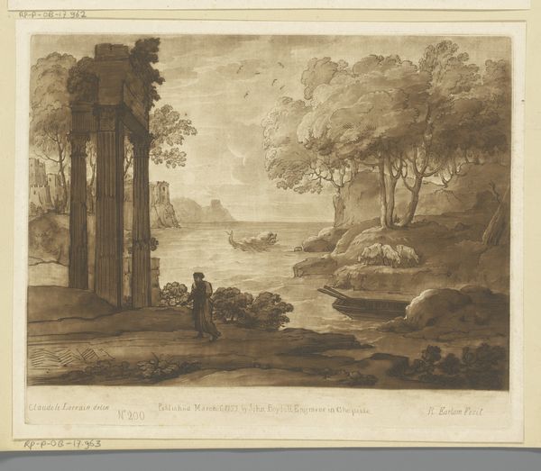 Richard Earlom created this sepia-toned etching, "Landscape with a Resting Shepherd and Four Cows Crossing a River" in 1778. This print, made in England, reflects the 18th-century fascination with pastoral scenes and the romanticized view of rural life. The image presents an intriguing view of labor and leisure. While the cows bravely cross the river, the shepherd is resting. This highlights the way labor is distributed across gender lines: the animals are feminine, while the human is masculine. How does this affect our reading of the image? By centering the shepherd, Earlom draws on classical traditions, and the image evokes a sense of idealized simplicity. Yet, the presence of classical architecture in the background infuses the scene with a certain nostalgia for the glories of the past. Consider how Earlom uses the pastoral to evoke both the harmony of nature and a longing for a bygone era. What feelings does the artwork evoke in you?