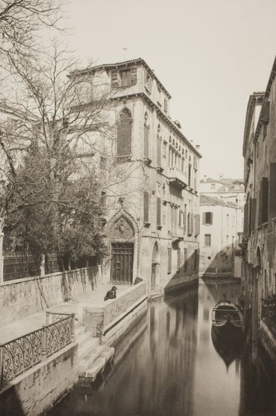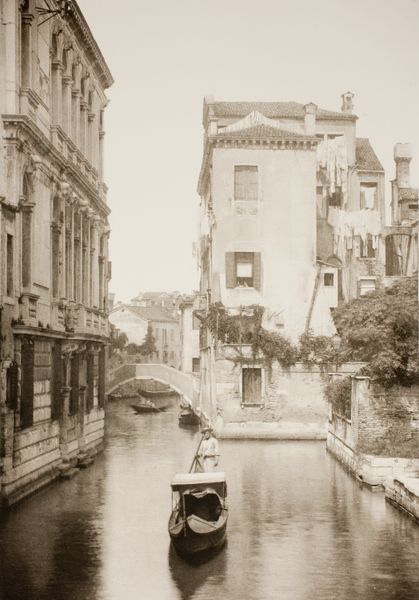Curator: Look at this striking image titled “Untitled (II 41)” believed to be created around 1890. The artistry of Ferdinando Ongania certainly captured a moment steeped in Venetian history. It employs aquatint and etching techniques. Editor: Wow, that's old-school Venice! I can almost smell the canal water...and hear the echoes. It has this sepia tone vibe which sets this scene. Gives you a bit of the melancholies if you know what I mean. Curator: Note how the linear perspective pulls the viewer's eye deep into the scene. Ongania meticulously balances architectural elements with the fluidity of the canal, creating a cohesive spatial relationship. A remarkable interplay. Editor: For me, it is more how those pillars interrupt that space - creates depth I wasn't expecting - it's like I want to keep discovering new perspectives. Look! Even that little statue peeking over that wall gives the city some much needed personality. Curator: Interesting point! I observe Ongania leverages chiaroscuro to model the buildings and figures which not only adds definition, but also enriches the artwork's texture. The lighting is absolutely key, no? Editor: Totally. I just feel there's more to the narrative than light and shadow. Like, that gondolier—he seems frozen in time but that is somebodys actual life in that boat, right there. All his daily mundane beauty. Curator: It reflects upon broader themes. This artwork employs photographic elements to express that relationship between photography, romanticism and history, thus shaping the interpretation in interesting and unforeseen ways. Editor: In the end, Ongania gives the silent image a voice – not too much different from what we are trying to do right now, ha. To reveal layers that at first pass remain muted but hold their truth once coaxed. Curator: A keen and succinct appraisal indeed. One cannot deny its value and legacy as it reminds us how interpretation enhances appreciation. Editor: Couldn't agree more, old pal. Makes you wanna grab a sketchbook and go find your own unspoken stories, doesn't it?