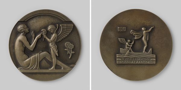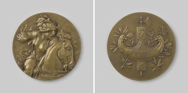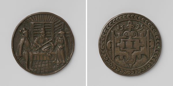 This is a guild badge of Pieter Ryckx, sculptor, rendered anonymously in bronze. The oval shape is bisected by figuration on both sides, creating a striking, textural bas-relief. On one side, a bull's head rises above a shield, encircled by foliage, emblems of prosperity and artistic cultivation. The reverse features Pieter Ryckx's name floating above an assortment of musical instruments. The drum, stringed instrument, and cymbal, point to celebration and harmony. Through a semiotic lens, the badge blends the heraldic with the artistic, signifying a community bound by craft and shared cultural values. This badge is not merely ornamental; it is a coded object communicating status and belonging. The bronze material, itself durable and enduring, mirrors the guild's commitment to preserving artistic traditions. This badge embodies an intersection of identity, artistry, and collective purpose.
