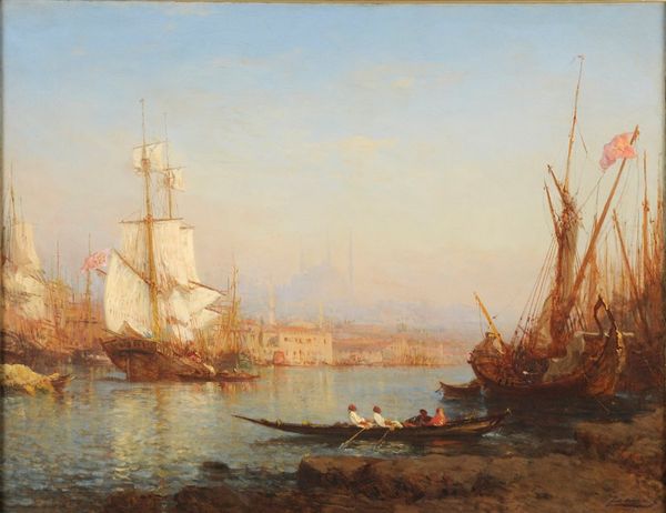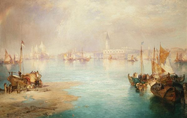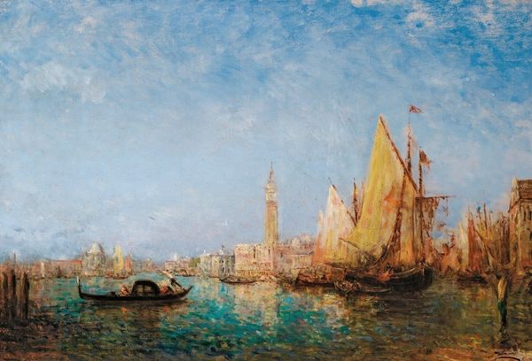 Curator: Before us hangs Felix Ziem's, The entrance to the canal, Marseille, an oil painting on canvas. Editor: The shimmering blues and yellows initially strike me, evoking a tranquil yet active harbour scene, reminiscent of Venetian paintings. It's both realistic and a bit dreamlike. Curator: Ziem, while often associated with the Barbizon school of painting, cultivated a very personal impasto technique. Observe how he layers and manipulates paint, generating textures, building up the forms and infusing light and a tangible sense of atmosphere throughout the whole composition. Editor: And looking closer, the city here takes on a hazy quality. It makes me wonder what the political situation of Marseille was during this period, if its openness to trade and maritime activity factored into the piece at all? Curator: While undated, it shares affinities with Ziem's cityscapes after 1860, and reflects the transformation of Marseille with increasing trade. His emphasis, though, is undeniably on capturing the dynamism and brilliance of the port rather than documenting specifics. Editor: Right, that certainly comes through! There’s a feeling of bustling maritime commerce – the many small figures on the ships, the variety of vessels depicted – all points towards this image serving as a depiction of industrial activity and port life. But where do we, as the observer, fall into the social politics depicted? Curator: I'd agree, though Ziem focuses on aesthetics more than strict socio-political narrative. The chromatic interplay, the brushwork's verve — these compositional features take precedence over conveying distinct statements about labour and society. His baroque approach emphasizes visual stimulation over political context. Editor: But shouldn't art offer more than just chromatic interplay? Shouldn't it reflect upon society in some capacity or ask for an intentional understanding? Curator: Its artistic merit, I would say, lies in its formal qualities rather than social commentary. Editor: Well, regardless, it's fascinating to consider both perspectives; the painting’s visual attributes, and its potential socio-historical implications. It does create such a stimulating dialogue, no? Curator: Yes, art often thrives in the space between interpretation.