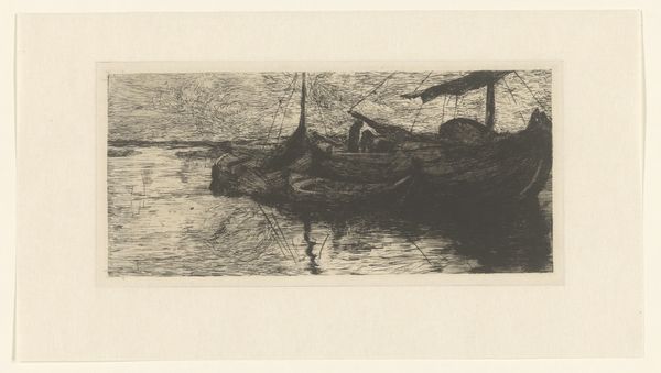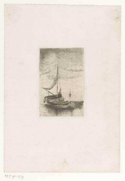 Curator: Before us we have "Boot op de Adour" or "Boat on the Adour", an etching by Carel Nicolaas Storm van 's-Gravesande from around 1870 or 1871. It’s part of the Rijksmuseum collection. Editor: It feels like a half-remembered dream, doesn't it? Like a whispered story from a sailor, all grit and faded ink. It almost evaporates before you can grasp it. Curator: That sense of transience really comes from the etching process. The delicate lines, the way he captures the light reflecting on the water – it's a testament to the skills involved in printmaking. It also really puts labor at the forefront for consideration. Editor: Absolutely. And beyond the craft, there's something so melancholic about that lone boat. It evokes such stillness but feels so lost in that blurred scene. There are other figures present, but I can't see who or what they are! Curator: It’s the Adour River. The waterways were the economic veins for much of Europe at this point. It really is about industrial movement and material exchange with sailboats serving the crucial purpose. Editor: Of course! That actually resonates so well with the hazy figures now. I am now understanding that the picture is about life unfolding quietly along the waterway. But there’s an element of surrender as if those little blurry people on the Adour are merely tiny cogs in the huge commercial world around them. Curator: Van 's-Gravesande, through this etching, not only demonstrates his technical ability but he gives us insight into the economic landscape of that time. What was produced in 1871 and for what social class is the real core. Editor: Which allows us to see his boat as so much more than a static image – we realize it is one working piece of a giant material exchange network. That's given me a new depth of perspective.