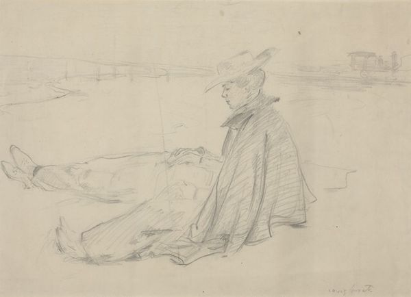 Curator: There’s a wistful sort of stillness to this, isn’t there? A delicate melancholy. Editor: Indeed. Here we have Jean-Louis Forain’s ink drawing of a "Woman on a Beach with Sketch of Standing Figure in Background." The sketch’s direct relationship to production processes invites considerations around artistic labour and the conditions of art making itself. Curator: Labor, huh? She doesn’t strike me as a worker, not in that dress, on her hands and knees on the sand. There’s something vulnerable about the pose. I imagine her lost, maybe searching for something precious. Editor: Well, the seeming ease, even casualness of Impressionistic renderings often belies the labor embedded within it. What tools were used? What processes shaped this image, and by whose hand? Curator: That brown ink feels so raw, earthy almost, and immediate—he gets the feeling across even with so few strokes. Like it just appeared out of the sand itself! Editor: Right, and by using readily available, modest materials, Forain avoids the traditional constraints of high art, bringing our attention to everyday realities and the accessible nature of the creative process. Curator: Look at her hands pressed to the sand, anchoring her. While in the background that other figure seems almost ghost-like, ephemeral. Two halves of the same coin, maybe? Editor: That may very well be. And this pairing could provoke thought about societal structure, or relations. After all, we as interpreters can read these relationships in parallel with systems of class and economy. Curator: I’m mostly seeing loneliness, a longing that seeps out of the page. That slight gesture, as if she’s about to crawl further, reminds me of those moments in life when all you want to do is just disappear into the landscape. Editor: I appreciate your engagement. Thinking about it, I see not an escape from life, but maybe more, the act of forging it; using accessible tools, the raw materials that lie everywhere under our feet. Curator: And who knows, maybe she will pick up a tool herself and draw in the sand when Forain leaves.