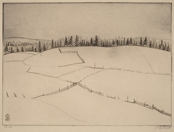 Curator: "Winter Road," painted by Arkady Rylov in 1915, showcases a landscape dominated by snow and trees, rendered in oil paint. It's fascinating to consider Rylov's exploration of winter's quietude through the Impressionistic lens. Editor: Well, my first thought is how deceptively simple it seems, then the silence hits you, right? It’s the sort of painting that hums with stillness, with potential just bubbling beneath all that white. Like a giant sleeping polar bear under a blanket. Curator: It's true, there’s a remarkable stillness. Winter itself is often associated with introspection, but consider how this scene uses symbols we are used to connecting to the other seasons like evergreens. There are multiple visual elements that represent eternal life in pagan traditions that persist into modernity. It reminds me that the ground under the snow teems with life waiting for spring. Editor: Oh, I like that. And those stark trees, the way they claw at the sky... there’s a certain starkness, of course, but also, dare I say, resilience in them, reaching, striving even under the harshness of winter. It kind of asks: What persists when everything *seems* dormant? And where are we on that metaphorical road? Curator: I think Rylov manages to capture both the harshness and the inherent beauty. You notice the tracks carved through the snow? Consider how paths act as very direct symbols for personal life choices and legacies, but note how little details can affect our perspective of this symbolic form. In this picture they're a symbol of travel through life itself, marked not with harsh finality but soft watercolor and impermanence. It makes me consider that nothing lasts, everything shifts, yet the painting makes it beautiful. Editor: Beautiful and strangely hopeful. The horizon line is not completely obscured, hinting at something more beyond the white expanse and dark wood, an implied possibility. And honestly, the limited palette, for me it evokes an interesting sense of melancholy, and wonder, not the painful or isolating kind. Curator: That melancholy comes, perhaps, from recognizing winter’s inherent cyclical nature, with the evergreen offering a beacon through the harshest cold of this canvas. Editor: It really is incredible. A reminder that even in apparent dormancy, there's life, movement, hope on the "Winter Road."