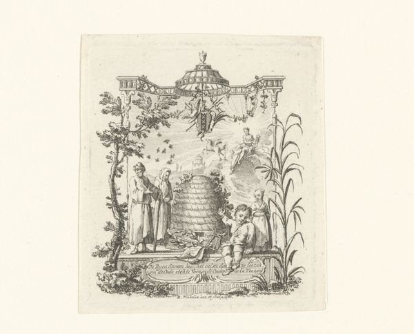 Curator: This print, created by Noël Le Mire in 1759, is titled "Two Putti by a Birdcage." It resides here at the Rijksmuseum. Editor: It has such a light and airy feel, doesn't it? Those little cupids… or putti, I suppose… seem so delicate against the slightly harsher lines of the cage. It’s baroque but almost verging on rococo, that lightness. Curator: Absolutely. Examining it through a materialist lens, notice the precise lines achieved by the etching process on paper. Etchings like this allowed for the relatively inexpensive distribution of imagery. Think of it: Le Mire could produce multiples of this design for a broader audience. These weren't necessarily for the wealthy elite; this imagery could be accessed by a rising middle class. Editor: And in terms of reception, the print likely served as a charming, almost frivolous, decoration. Birdcages themselves were symbols of status but the genre scene featuring playful putti speaks to the societal preoccupation with leisure. But what of the bird inside? Captivity juxtaposed with innocent freedom is certainly interesting. Curator: Well, perhaps that's where the materiality of the cage itself becomes more poignant. The craftsmanship of the cage versus the putti's idle interaction with it is hard to ignore. We must not forget, however, the art market's role in perpetuating this imagery and catering to popular taste through prints like this. Editor: So it speaks to a kind of visual consumption that mirrors the bird’s captivity. This image isn’t just passively decorative but indicative of a structure—an economic ecosystem sustained by these aesthetic preferences. How were such prints displayed, sold, collected? Were there print seller catalogs and networks influencing distribution? Curator: Precisely. The print functions both as a consumer good itself and as a symbol reflective of the tastes and, frankly, the social structure of the period. The imagery also mirrors Baroque era taste for refined goods for the wealthy consumer. Editor: Understanding its social context really elevates the print. I initially only observed the cute putti and the dainty cage, but the wider view truly enriches our experience. Curator: Indeed, reflecting on the production process, dissemination and sociopolitical role, all these factors give added depth to what may first appear as merely ornamental.