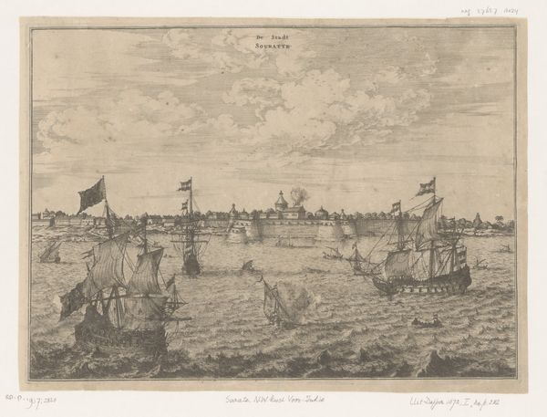Editor: This is an etching titled "View of Amsterdam from the IJ," created before 1711, artist is unknown. The scene bustles with ships – a real aquatic traffic jam! I get a sense of a prosperous and important city from this. What stands out to you? Curator: The air itself seems thick with history, doesn't it? Look closely – not just at the ships, which teem like water beetles on the IJ – but at the *feel* of Amsterdam rising in the background. That tightly-packed skyline, pricked by church spires reaching for heaven, reflects the incredible ambition and, let's be frank, the sheer, unadulterated *greed* that fuelled the Dutch Golden Age. See how the light seems to emanate from within the city, bathing the whole scene in an almost... well, holy glow? It's idealized, of course – propaganda even. Do you see the little puffs of smoke, the hint of conflict on the right? Editor: Yes, I see it. Is it accurate historically? Curator: Ah, there's the rub. This etching wasn't about stark reality, but about projecting an image, an aspiration. Prosperity doesn't come without conflict. The smoke adds a kind of visual tension, but more importantly reminds viewers that wealth required protection. Isn't that amazing how one little puff can contain a story? And how that story resonates even now, centuries later? Editor: I hadn’t really thought about the smoke as storytelling, but it makes perfect sense! Thank you! Curator: Anytime! It is amazing, what artists of the Golden Age were able to communicate through even the smallest details. A picture can say a thousand words.