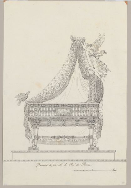 This is a design for a canopy bed, made by an anonymous artist using pen and watercolor. The bed's composition is dominated by a symmetrical arrangement of forms, with the canopy gracefully draped over a structure supported by imposing lion-shaped legs. Note how the artist employs a limited color palette, mostly muted tones with strategic highlights of gold and green. The interplay of vertical and horizontal lines creates a sense of balance, while the soft curves of the canopy contrast with the rigid geometry of the bed frame. Semiotically, the swans on top refer to something, such as love, fidelity or purity. The lion's presence suggests themes of strength and regality. The design reflects Neoclassical ideals, drawing inspiration from antiquity to evoke notions of prestige. The precise rendering and attention to detail elevate this design beyond mere functionality to an exercise in formal elegance. The work invites ongoing interpretations regarding taste, opulence, and the cultural significance of domestic spaces.