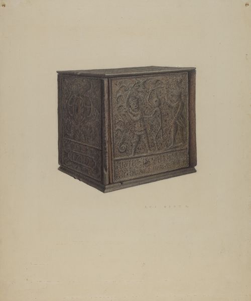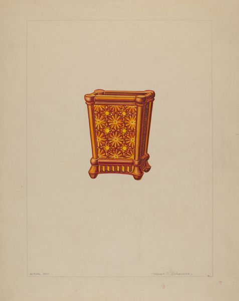 Curator: Today, we are looking at "Butter Mold," a drawing and watercolour piece from around 1940 by Franklyn Syres. The work also includes elements of wood, characteristic of the mold. What are your initial impressions? Editor: My immediate reaction is one of domesticity, but not in a cozy way. There's a certain restraint in the colors and the sharp edges that makes it feel more like labor than leisure. It’s quite small isn't it, with each mold design quite detailed. Curator: Yes, the scale invites close examination. Let’s consider the composition: two distinct, cube-like sections joined, each with a letter and foliate carving, centered on an empty background. Note the meticulous application of watercolour capturing the texture and subtle tonalities of the wooden mold. What draws your eye in this piece? Editor: For me, it's about labor division, how are the genders represented here? The tool embodies an older, agricultural era, probably where butter-making fell strictly into the domain of women, particularly on farms. Curator: The object depicted, a butter mold, obviously functions as a domestic tool, but what about its symbolic form? I suggest, if we carefully scrutinize its lines and geometry. The angular form, particularly the cubic blocks that constitute the mold, are a perfect example of postwar modernity that rejects all ornamentation. Editor: I see your point about modern rejection. But let's consider the other layer: the initials framed by leaves – personal branding. This suggests an act of personalization in what might otherwise be monotonous labor. It’s an act of resistance. And this tension resonates with women's complicated position, where both are marginalized, and must labor at this work. Curator: Perhaps we should reflect on Syres’ artistic choice. The medium, predominantly drawing and watercolor, allows capturing not only the object's likeness but also its feel; the grain of wood almost palpable beneath the layers of pigment. Editor: Yes, and watercolor in this context itself represents an act of copying, almost documenting the design and the tool itself. Does the artist have his own feelings of ownership to the design perhaps, rather than the mold itself? What are we really looking at here? Curator: It provides an introspective, nuanced interpretation of quotidian forms of domestic objects and production that continues to interest art lovers of our time. Editor: Indeed, by rendering a humble tool as high art, this watercolor opens broader conversations on design, work, gender, authorship, and the art of the every day. It continues to fuel reflection even in the 21st Century!