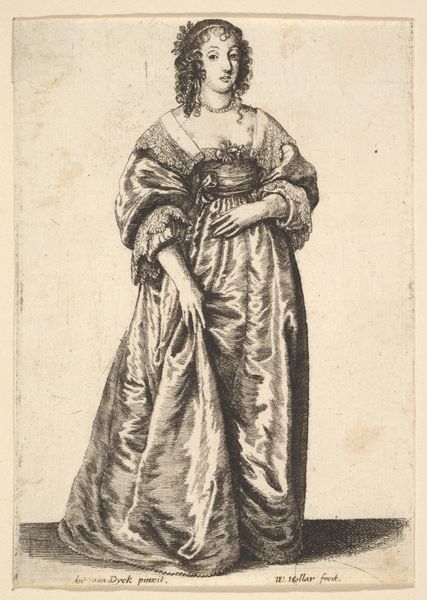Editor: Here we have Wenceslaus Hollar’s “Ciuis Londinensis Melioris Qualitatis Vxor,” an engraving from 1643. She's identified as a "Merchant's wife of London," and her clothes seem to make a bold statement about status. I'm wondering about the social implications. What can we unpack from this portrait about 17th-century London society? Curator: The details in her dress – the lace, the fullness of the skirt, even the hat – signal wealth and belonging to a rising merchant class. But beyond that, consider the context: 1643 was a tumultuous time during the English Civil War. Think about the function of portraiture then. Whose stories are prioritized, and why immortalize this particular woman at this moment? Editor: That’s interesting. I hadn't really connected her image with the political landscape. Would a print like this have been used for propaganda, or something similar? Curator: Not directly in the way we might think of propaganda today. But imagery, especially portraits, played a critical role in constructing identity and disseminating social values. A print like this circulated images of wealth and success, reinforcing certain social structures, even during wartime upheaval. To what extent do you think such prints democratized or consolidated images of power? Editor: That makes me think about the accessibility of images. Was this something only the wealthy merchant class would have had access to? Or could other parts of London society also obtain or see this portrait somehow? Curator: It likely circulated among those with means, solidifying their status. The deliberate visual encoding of status becomes an important political act through its consumption, reflecting power in image, in turn stabilizing an already shifting power dynamic within the city. Editor: That really reframes how I see this portrait. It's not just a picture of a woman; it's a statement about power and society during a pivotal moment in history. Curator: Precisely. It pushes us to question whose stories get told and how those stories contribute to the larger narratives of history.