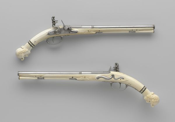 These two "Radslotpistool," or wheel-lock pistols, were made by Jan Kitzen in the Netherlands. As a technology, the wheel-lock was developed around 1500 and was the next major innovation in firearms after the matchlock. These pistols were likely owned by wealthy individuals, who would have needed to commission such elaborate pieces of craftsmanship. Consider what this kind of personal armament meant in the Netherlands. Was this a symbol of personal status and power, or was it a practical tool for self-defense? Perhaps both. As historians, we seek out inventories, guild records, and similar documents to understand the social context that shaped the production and use of objects like these. What stories do these pistols tell about the people who owned them, and the society in which they lived? The answers are in the archives, waiting to be discovered.