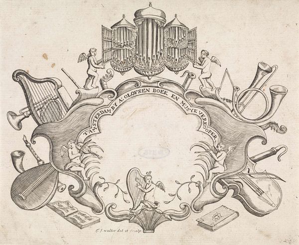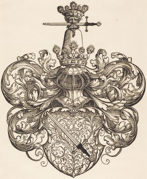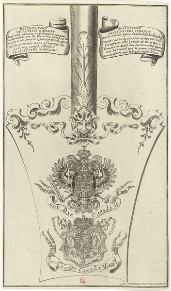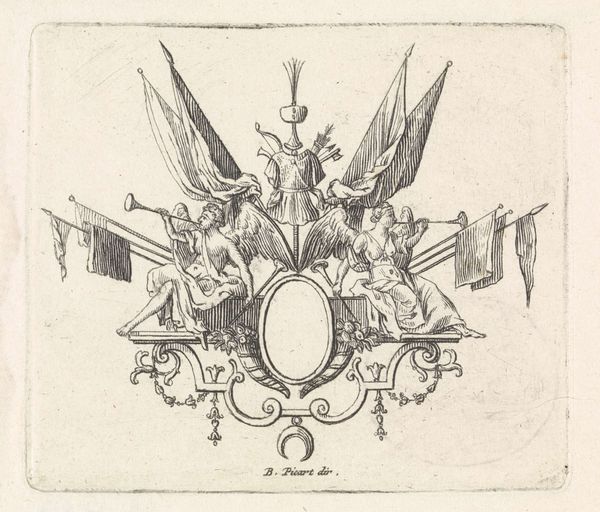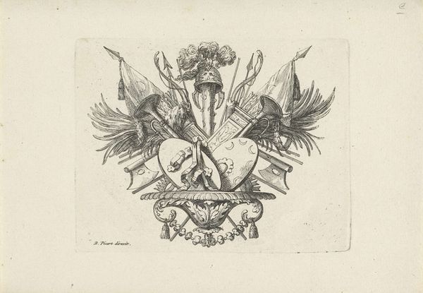 Bernard Picart created this line engraving of a sword, crown and laurel wreath in the early 18th century. The intricate linework forms a densely packed, symmetrical composition, evoking a sense of formal order. Note how Picart uses hatching and cross-hatching to create tonal variation and depth. The sword acts as a central vertical axis, piercing through a collection of symbols: flags, spears, foliage, and ribbons. The crown and laurel wreath at the top signify victory and honor, while the sword represents power and justice. Consider the semiotic relationships at play here; each element functions as a signifier within a complex system of meaning. The arrangement suggests a hierarchy, perhaps reflecting the social and political structures of the time. Ultimately, the engraving presents a constellation of symbols inviting us to decode its message, while acknowledging that its meaning remains open to interpretation.