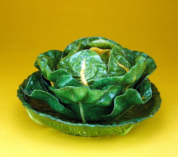 This anonymous covered bowl sits on a matching plate, both made from glazed earthenware. This piece draws on a long history of ceramics made in imitation of organic forms, specifically fruits and vegetables, common throughout Europe from the Renaissance onward. This kind of production was particularly associated with the workshop of Bernard Palissy, the 16th-century French potter. Palissy and his followers broke with the classicism of the Italian Renaissance, embracing naturalism. The production of ceramics like this one speaks to the establishment of European art institutions. Academies and schools encouraged the use of classical forms but were often faced with the popular appeal of the natural world. Further research into the context of this piece might explore how the hierarchies of art were constructed through debates about the value of different subjects and styles.