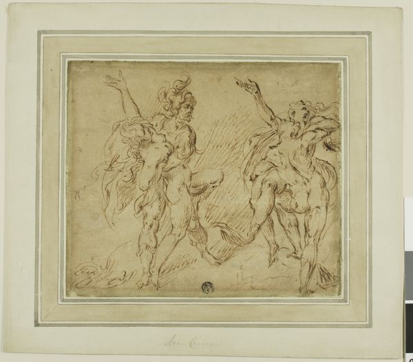Editor: This is "The Drunkenness of Noah," a drawing by Andrea Sacchi, dating roughly from 1599 to 1661, rendered in charcoal. The use of sanguine creates an almost ethereal atmosphere, but what structural elements truly stand out to you? Curator: Consider the deliberate placement of Noah. He's splayed diagonally, bisecting the pictorial space and compelling the viewer's eye to move across the composition. The group tending to Noah create a secondary diagonal line, establishing counterpoint within the whole. Notice how Sacchi exploits the formal qualities of line to imply movement, thereby instilling the drawing with tension. Editor: That interplay you noted… It almost feels like the figures are suspended in a delicate equilibrium. Is it accurate to read any further symbolism into that structural tension? Curator: Perhaps. The imbalance created by the horizontal versus diagonal relationships could easily reflect a disjunction between his state and the appropriate state as implied through others’ actions. Consider, for example, the texture created through layering, hatching, and cross-hatching… wouldn’t you agree this activates the figures, particularly that of Noah, while grounding them within a distinct formal plane? Editor: I do. I see how the variations in the red chalk modulate the forms. It lends depth and realism to the bodies while highlighting the figures’ dramatic poses. It also contributes to the emotive quality of this drawing. Curator: Precisely. By privileging a structured composition, a mastery of line, and by working towards proportional perfection, Sacchi creates a visual drama divorced from the trappings of mere narrative. What Sacchi focuses on is using forms, not symbols. Editor: So, in essence, Sacchi’s primary concern isn't about telling the Biblical tale but exploring form and creating dramatic interplay in shape and movement? Curator: Correct. A compelling tension, don’t you agree? Editor: Absolutely! Thanks, that makes a lot of sense. I'll definitely look more at the structure of artworks from now on.