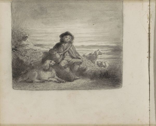 Editor: So, this is "Rustende jager" or "Resting Hunter," dating from somewhere between 1836 and 1880, made by Abraham Van der Waijen-Pieterszen using ink on paper. The scene definitely feels melancholic, like a moment of quiet reflection. What do you see in this piece? Curator: It feels like a portrait of weariness, doesn't it? Look at the landscape – more of a suggestion than a detailed vista. It’s as if the external world mirrors the internal state of our resting hunter. I wonder what thoughts occupy his mind? The use of ink on paper lends itself to a sort of ephemeral quality, a fleeting moment captured. Almost like a sigh sketched onto the page. And that sleepy dog at his feet—do you think that is meant to echo his own exhaustion? Editor: That's an interesting point about the landscape being more of a suggestion. I hadn't thought of it as mirroring his internal state, but it makes sense. And, yeah, the dog mirroring his exhaustion… definitely! Was it common to depict everyday scenes this way back then? Curator: The period produced art across the spectrum. What strikes me is the intimacy here, the vulnerability. It sidesteps the heroic or overtly dramatic. We aren't witnessing a grand hunt, but a moment after, maybe a failed attempt, or perhaps he is just contemplating life. Van der Waijen-Pieterszen captures a very human moment with the subtlest of touches. And there is beauty in that, I think. Editor: I see what you mean. It's less about the hunt and more about the hunter's state of mind. It feels surprisingly modern in that way. I really appreciate how it captures a quiet moment with such depth. Thanks for sharing your perspective! Curator: My pleasure. It reminds me that sometimes the most profound stories are whispered, not shouted, onto the canvas – or, in this case, paper.