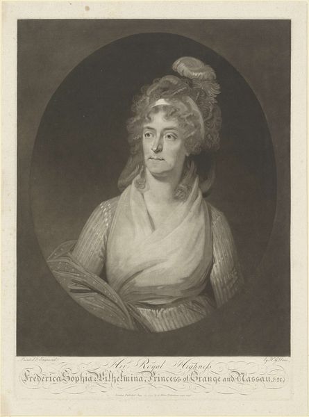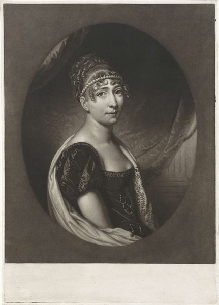 Curator: Here we have a fascinating print from the Rijksmuseum collection. This is a portrait of Wilhelmina of Prussia, dating from 1813 to 1819, made by Philippus Velijn. Editor: My immediate impression is of an almost spectral quality. The tight oval composition, combined with the greyscale of the engraving, evokes a sense of stillness and formality. Curator: It's a Neoclassical piece, very much in line with the era's focus on idealized representation. Notice how Wilhelmina’s status is projected through symbols of power and grace: the elaborate headdress, the formal attire. She’s not simply a woman, but a representation of Prussian royalty, even duty. Editor: Absolutely, but there's also an interesting tension. The engraving, while technically precise, creates a soft, almost dreamlike effect. The light isn't harsh; it diffuses, almost veiling her features, blurring sharp lines to express volume. The stippling is interesting in terms of mark making—each small dot contributes to this hazy visual impression. Curator: Yes, that subtlety softens the rigidity one might expect from a state portrait. And it connects with wider symbolism of the era. Consider the headpiece—lace framing the face—reflecting power, piety and tradition. These visual markers connect us to the societal ideals of the time. These engravings weren’t just aesthetic objects; they carried political weight. Editor: I'm struck by how Velijn used the limited tonal range of the print to suggest texture, especially in the fabric of her gown. It creates the illusion of depth within such a restrained medium. It reminds me how much semiotics are encoded into this process, where signifiers of social meaning also come into focus with light and dark. Curator: It reveals the image's enduring strength and ability to express symbolic truths of its subject, which is something I personally believe should not be taken for granted. This echoes throughout history as a form of constructed identity that is very telling about cultural aspirations. Editor: Indeed. And for me, the beauty of studying such a work is not simply in the narrative it constructs but also in appreciating how its delicate technical nuances convey emotion.